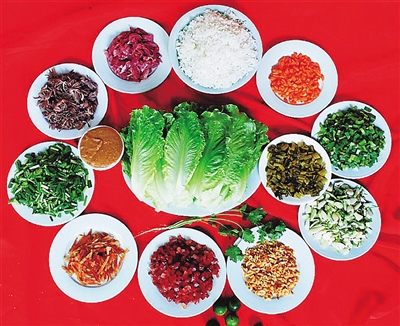 菜包饭是把肉、菜、饭混在一起。这种吃法有点原汁原味的野性,但味道独特,还有特别的寓意。