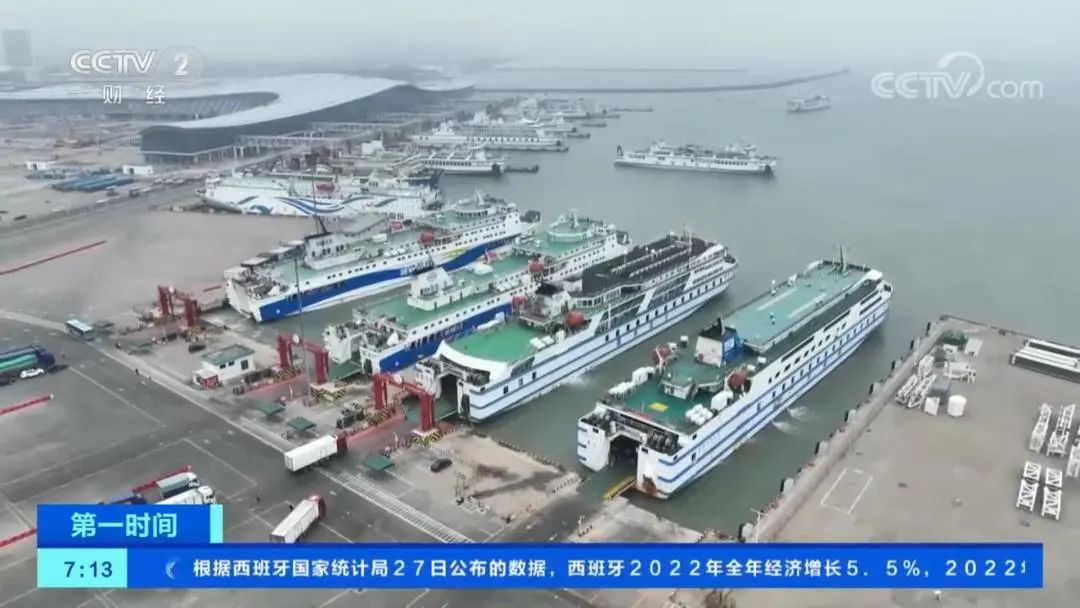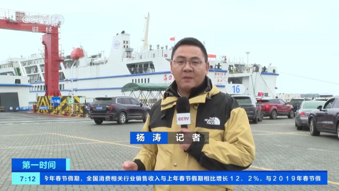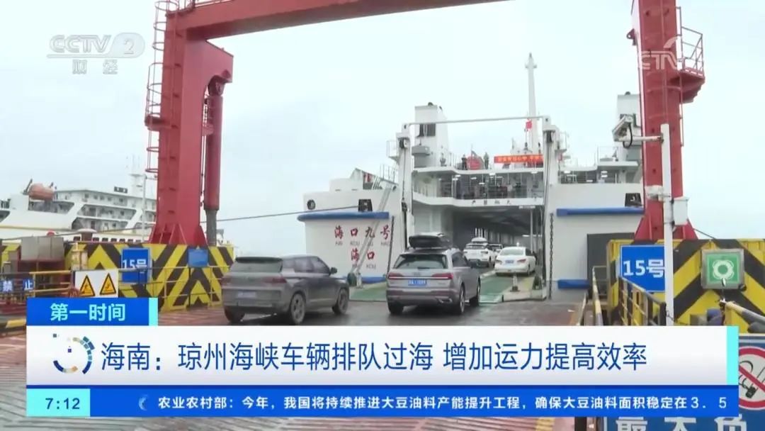 记者 杨涛:我现在是在海口新海港的码头内,现在泊位上是停满了船舶,在我身后的这艘船是刚完成装载准备起锚,而在旁边的这个泊位上,这些车辆是正在排队准备登船。