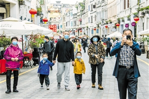 1月27日,在海口骑楼老街,不少游客携家带口逛骑楼。 本报记者 陈长宇 摄