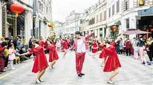 春节假期,漫步在充满南洋风情的海口骑楼老街,市民游客观看颇具特色的舞龙舞狮活动和丰富多彩的快闪表演,感受年味的浓郁、体验缤纷的民俗。