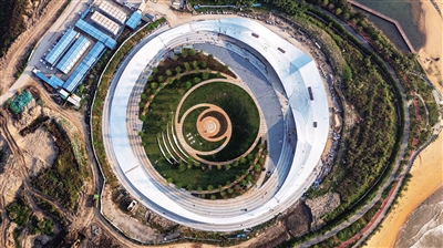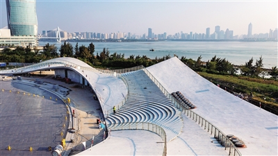 位于世纪大桥下的3号驿站云洞图书馆,犹如镶嵌在海口湾上璀璨的明珠,吸引着岛内外游客慕名参观。这座白色建筑面朝大海,像是多维的时空隧道,连接了城市与海岸、现实与想象,每年接待岛内外读者与访客已超20万人次。以云洞图书馆为核心,周边岸线、儿童游乐区、足球场、餐饮等各类娱乐休闲配套设施与文艺演出不断完善丰富,打造出一个文体活动交流的新空间。