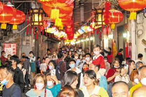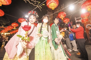 ▶府城元宵换花节如期而至,市民游客身着盛装观灯换花。 本报记者 苏弼坤 摄