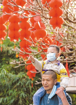 ▲元宵佳节,市民游客携家带口在琼台福地游玩。 本报记者 苏弼坤 摄