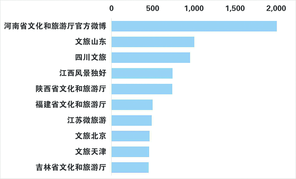 从原创微博发文数看,河南省文化和旅游厅官方微博、文旅山东、四川文旅排在前列。
