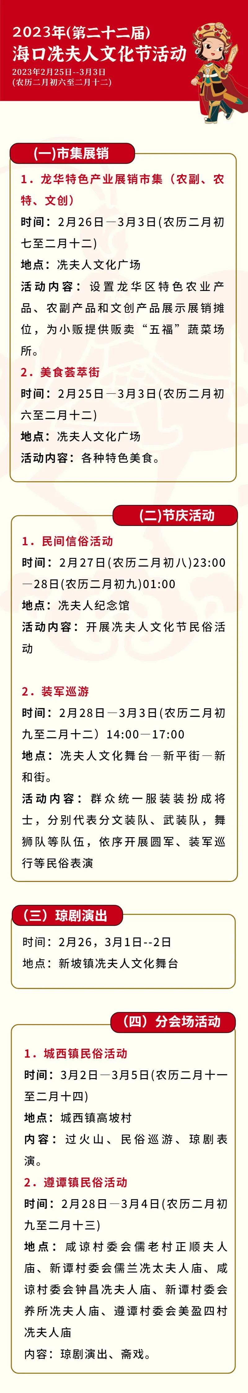 2023年(第二十二届)海口冼夫人文化节活动将于2月25 日至3月3 日(农历二月初六至二月十二)在海口市龙华区举行,融合文化、旅游、农业等内容将给市民游客带来一场民俗文化大赏。