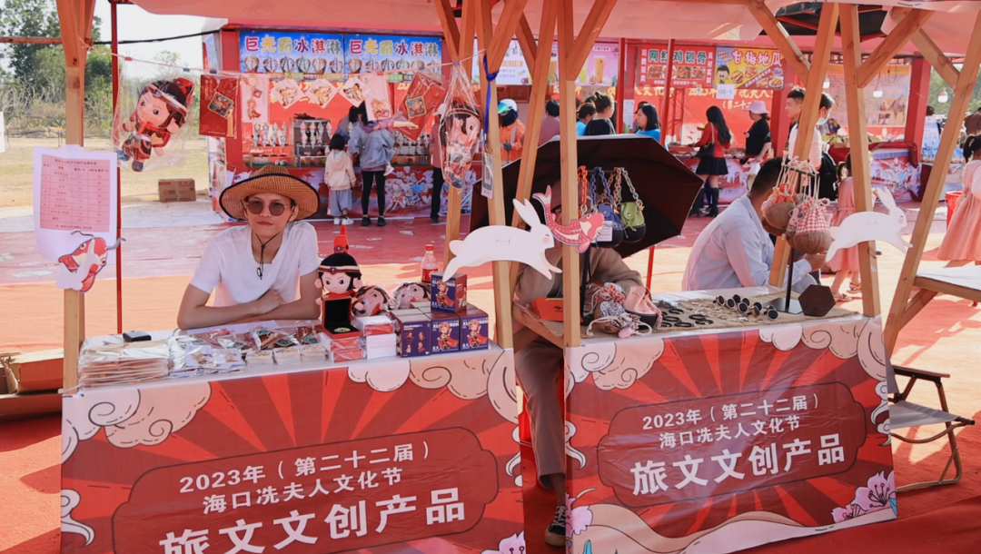 值得关注的是,除了当地的特色农产品,还有龙华区推出的文创产品展销展台。英姿飒爽的冼夫人卡通手办立像,惟妙惟肖的玩偶形象,创意团扇,御守好运符和五福飘带等十款周边商品吸引了不少带着孩子来的家长。通过椰雕文创设计大赛推出的椰雕周边商品独具特色,只见一块块的椰子壳,通过手工艺人的巧手,变成了特色车载香薰,椰子手提包,椰壳首饰等物件。民俗文化与创意产品融合,让游客们既感受到了传统的信俗韵味也感受到了现代的文创气息。