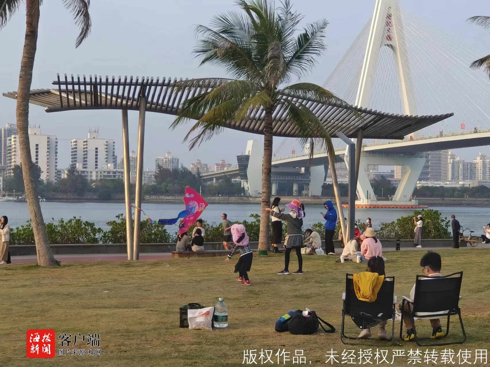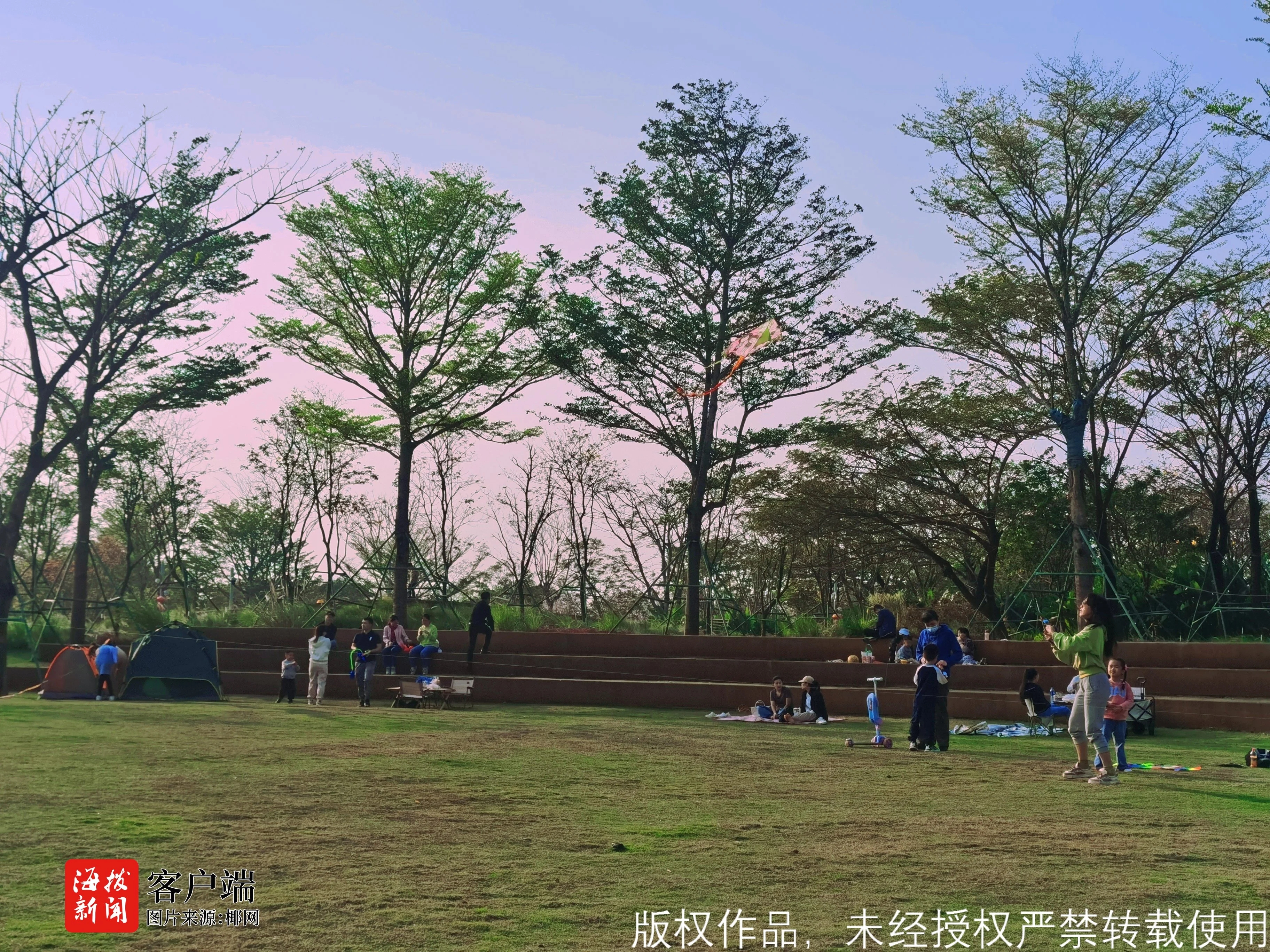 “今天天气真好!一起去看日落吧!”“今天天气不错,适合出门‘觅春’,到海口骑楼买点斑斓糕、椰子水、清补凉等特色美食,这个周末会过得特别惬意。”“春天的天气可真好,阳光温暖,春风和煦,让我流连忘返。”……每逢周末,海口世纪公园的草坪上就会搭起许多帐篷,不少市民和游客聚在一起,有的弹吉他、有的吃美食、有的玩游戏,孩子们在草地上放飞五颜六色的风筝,快乐地玩耍。