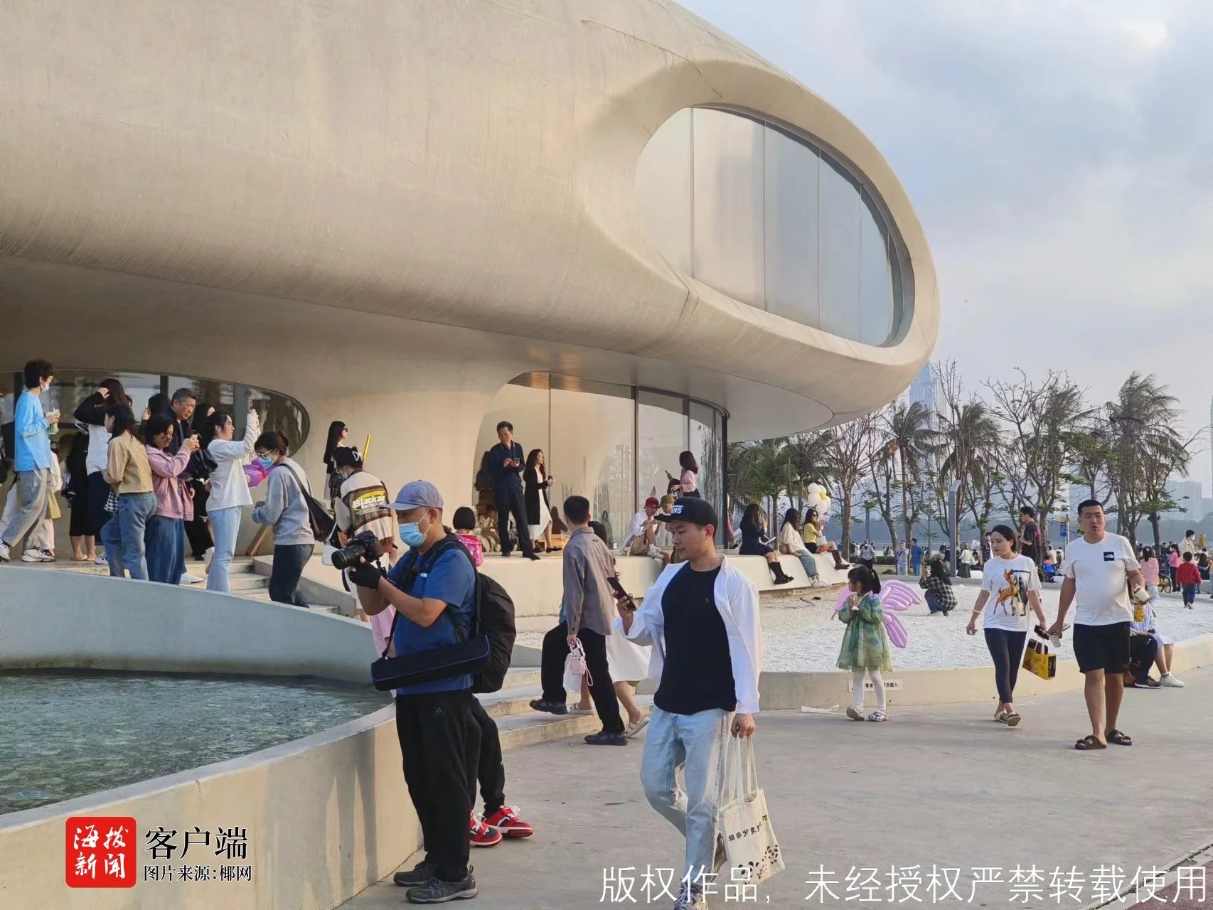 遇到天气晴朗又正逢周末的日子,海口湾的云洞书店附近就会聚集许多市民和游客。人们或是拿着手机拍夕阳,或是合影留念,又或是吹着晚风散步,太阳在西边缓缓落下,带着淡淡的金色光芒,照得两岸的高楼和世纪大桥都闪闪发光,仿佛置身仙境一般。“这会儿海南的温度真舒服,风也凉快,景色也不错!”外地游客陈先生感叹道。