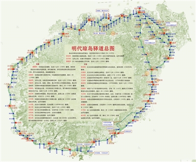 琼崖驿道古来有之,为何选取明代琼岛驿道总图作为琼崖古驿道的全貌展现?原来,经过研究推演,何以端认为现存记载完整的海南古驿道,是明洪武三年 (1370年) 重新开始有序运行的,其效能可靠,反映了华夏文化的领先水平,其中不少路段是对更早的宋元线路的继承。按明代记载环岛驿东、西两厢的长度,分别为1110里和1120里,共合2230里。