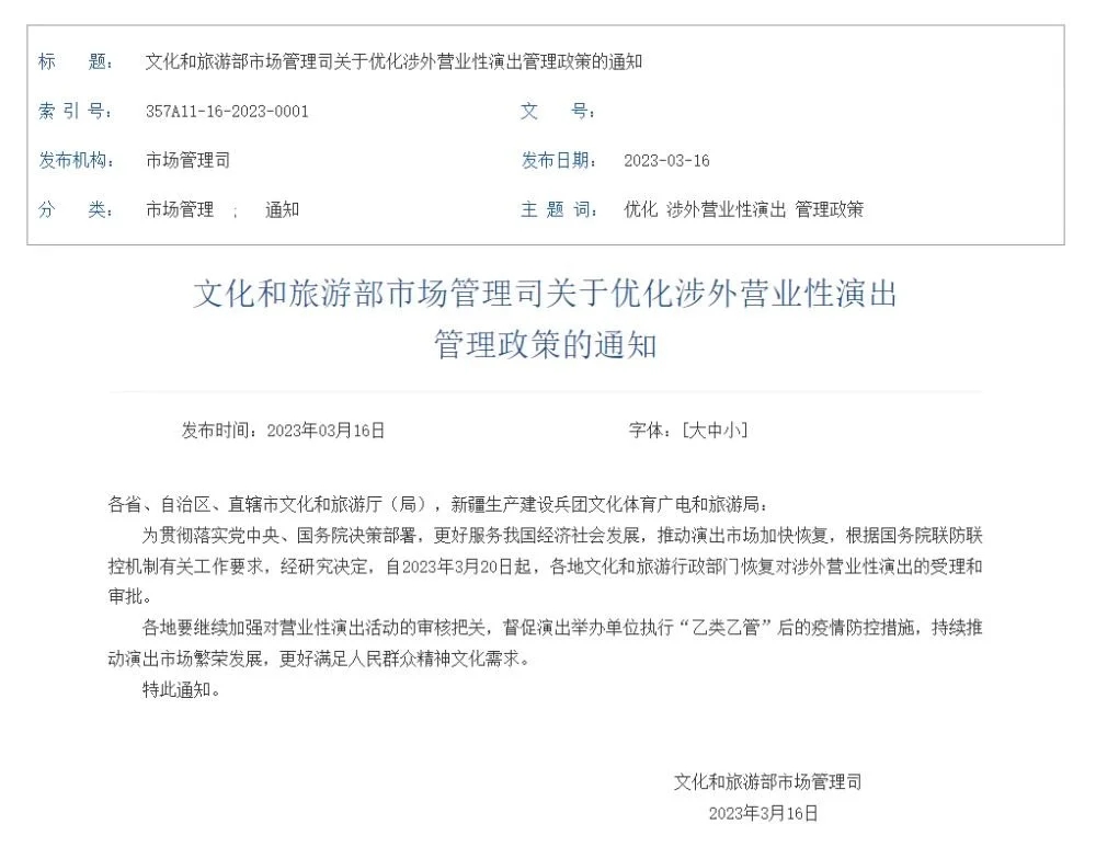 为贯彻落实党中央、国务院决策部署,更好服务经济社会发展,推动演出市场加快恢复,文化和旅游部今天印发“关于优化涉外营业性演出管理政策的通知”,根据国务院联防联控机制有关工作要求,决定自2023年3月20日起,各地文化和旅游行政部门恢复对涉外营业性演出的受理和审批。