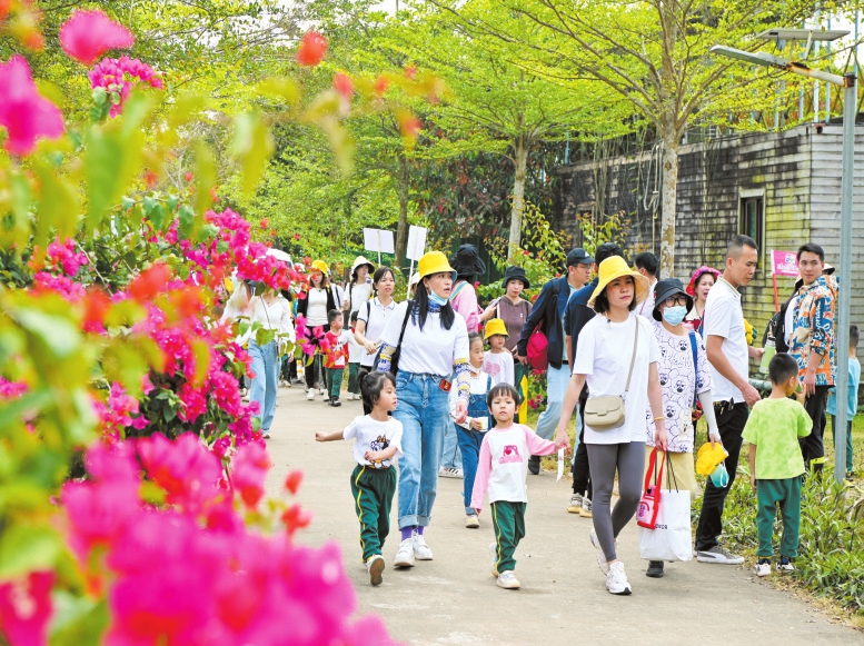 ①进入3月,海口城乡处处百花争艳,吸引大量市民和游客前来赏花观景。这是3月19日,市民游客在琼洲文化风情街特色三角梅展赏花。 本报记者苏弼坤摄