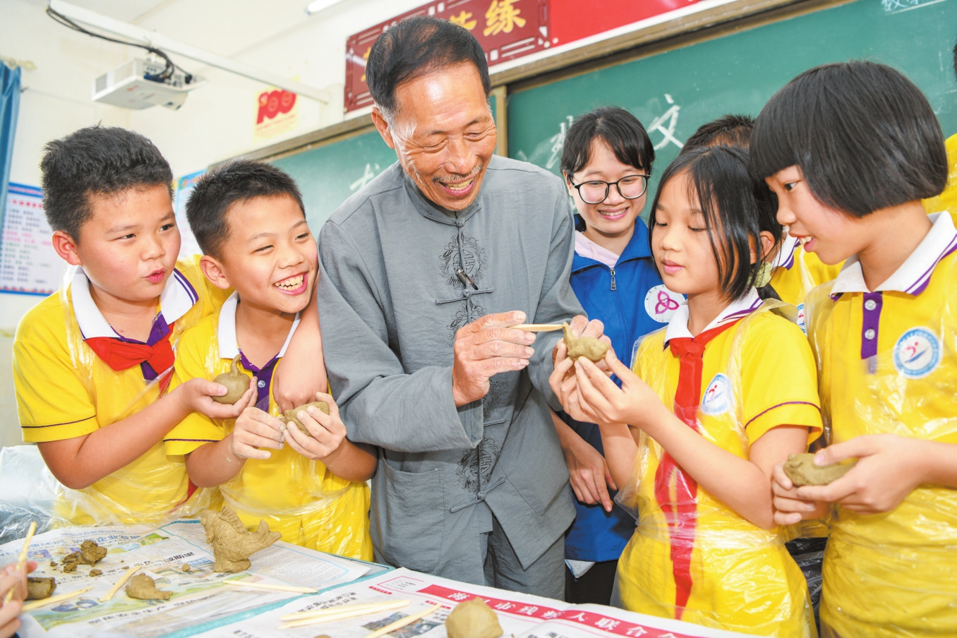 “先把泥搓成团,再慢慢把尾巴的形状捏出来……”站在讲台上的王科美拿起一个泥团,慢慢将它搓成一头粗一头细,再将细的那端捏成鱼尾状。随即,他又使用刻刀等工具,将鱼鳍、鱼头、鱼鳞等一 一雕刻出来。不一会儿,一条活灵活现的甩尾泥鱼就呈现在学生面前。在示范了泥鱼的雕刻方法后,王科美开始让学生尝试使用泥团塑造不同的形象,他则走下讲台,为学生仔细讲解泥雕的雕刻要领。