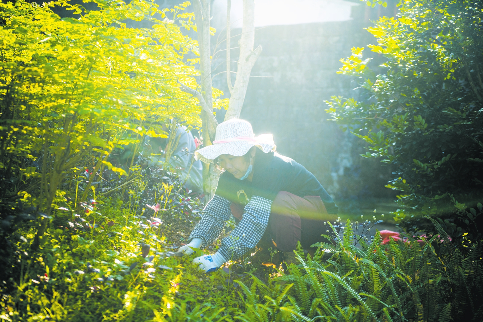 近日,在美兰区瑶城古村民宿,在此工作的附近村民正在修整民宿周边的美化绿植。本报记者陈长宇摄