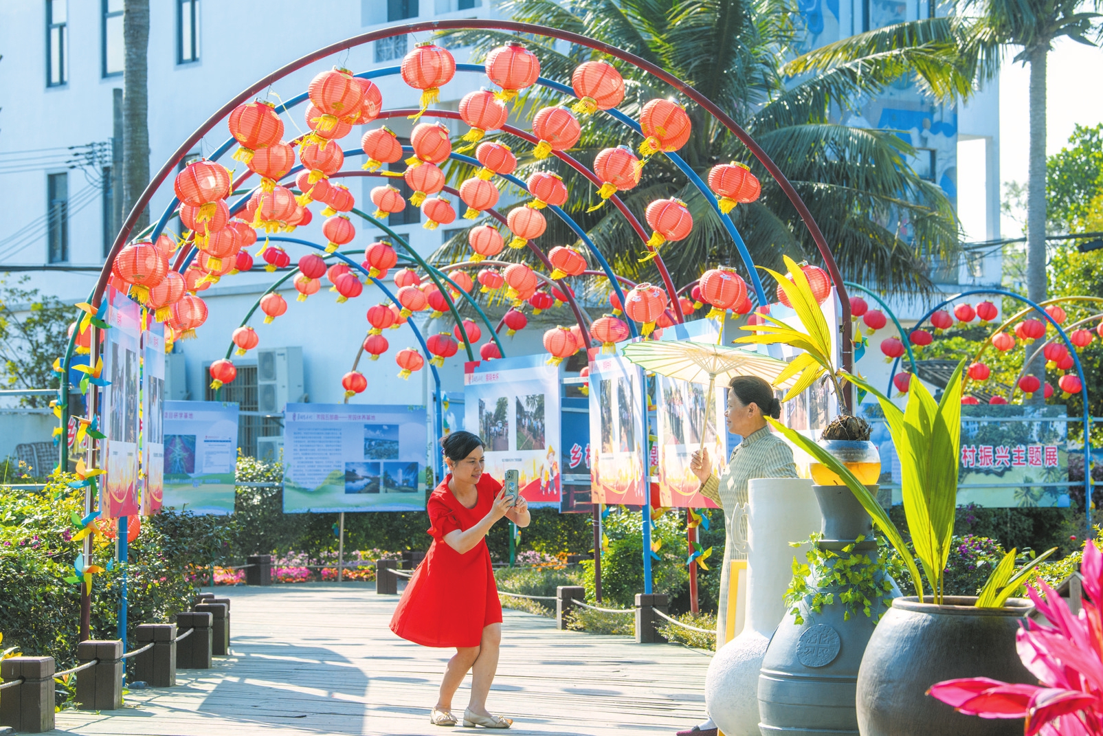 近日,在美兰区芳园村内,别致的红灯笼景观吸引了不少游客在此“打卡”留念。本报记者陈长宇摄
