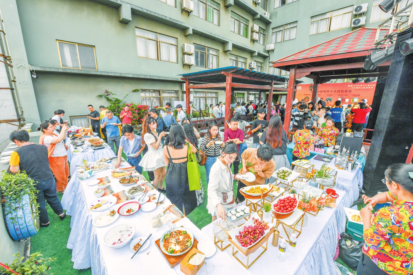 ③4月10日,在琼山区海岛森林酒店,市民游客品尝琼山特色美食小吃。 本报记者 孙士杰 摄