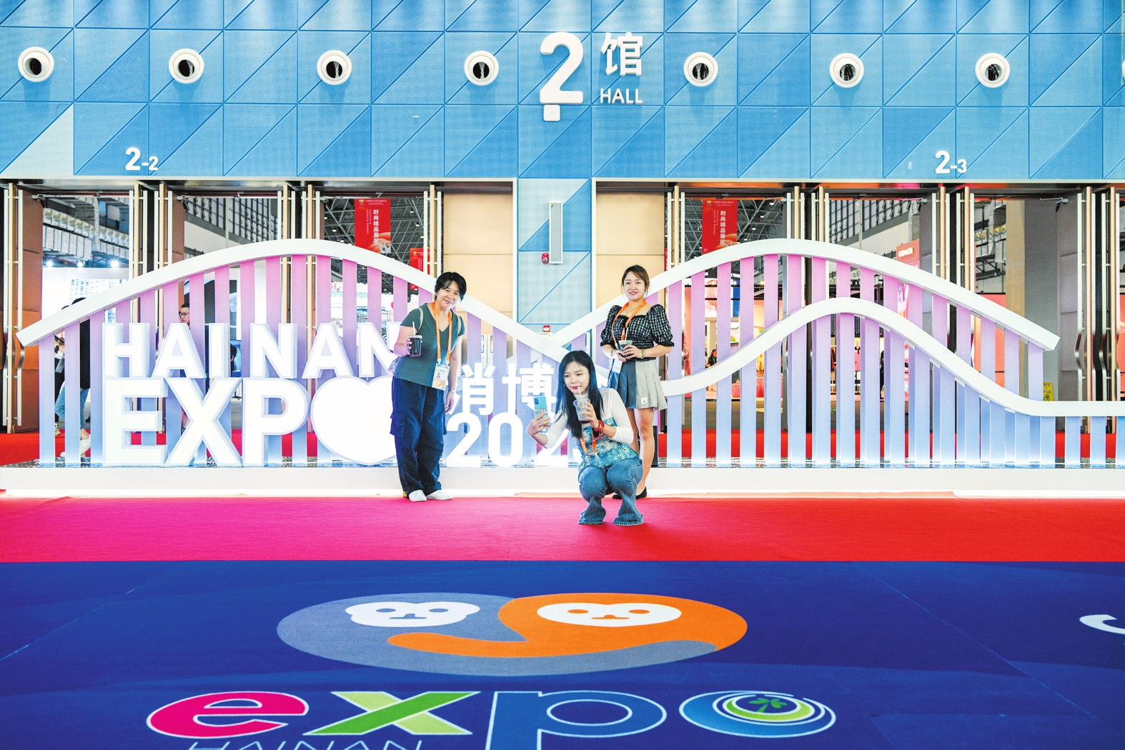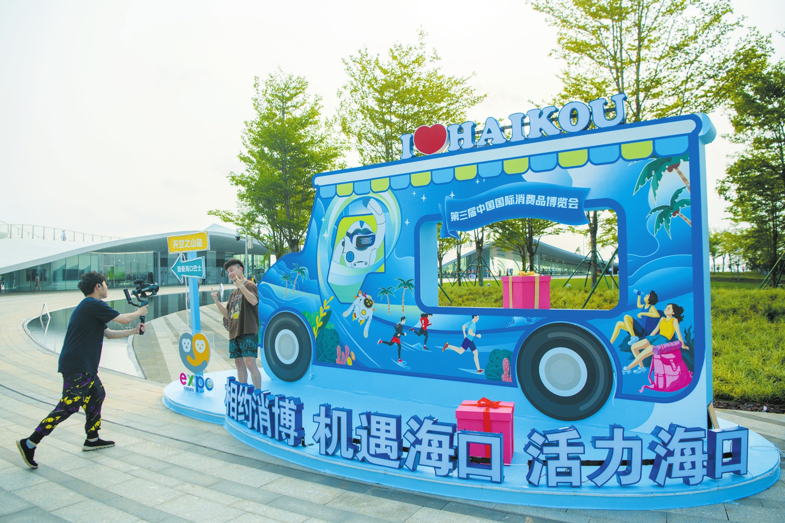 ①4月10日,在海南国际会展中心,参展人员在消博会展馆前打卡留念。 本报记者 苏弼坤 摄