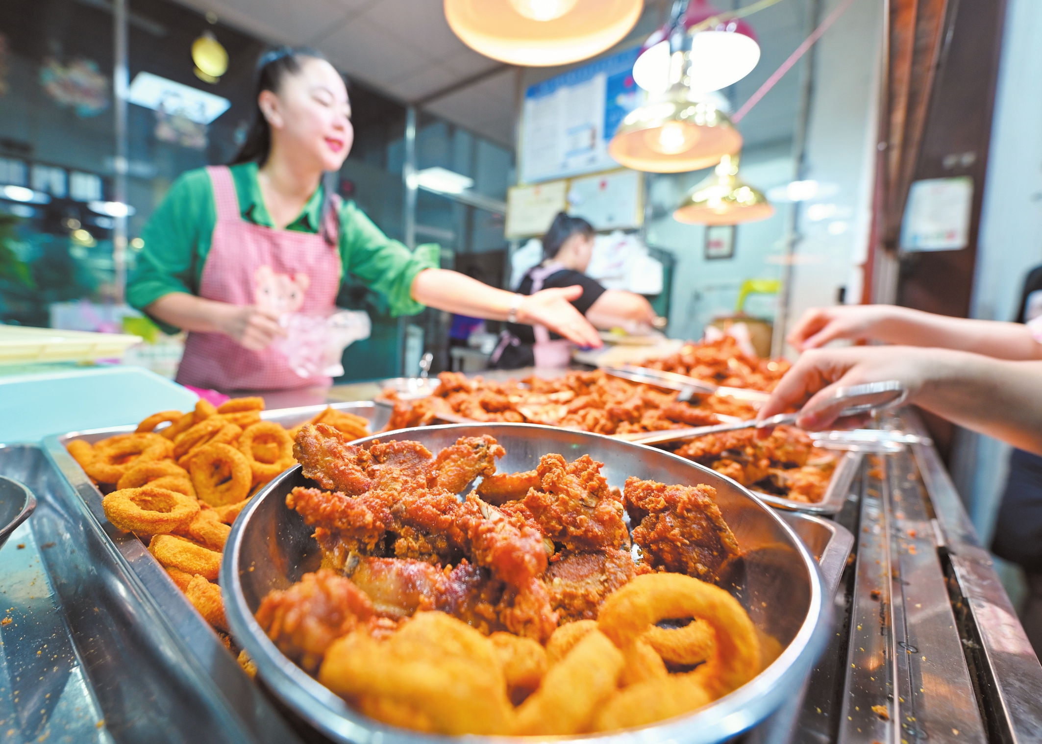 蒜香猪排、牛排、中翅、洋葱圈、鱿鱼圈……在吴日彪蒜香猪牛排水巷口分店,每一样都值得品尝,蒜香味十足的猪排、外酥里嫩的鸡翅,每样咬下去,都口齿留香,“嘎嘣嘎嘣脆,越嚼越香。”付完钱,啃着热乎的猪排,游客章绮连呼过瘾。