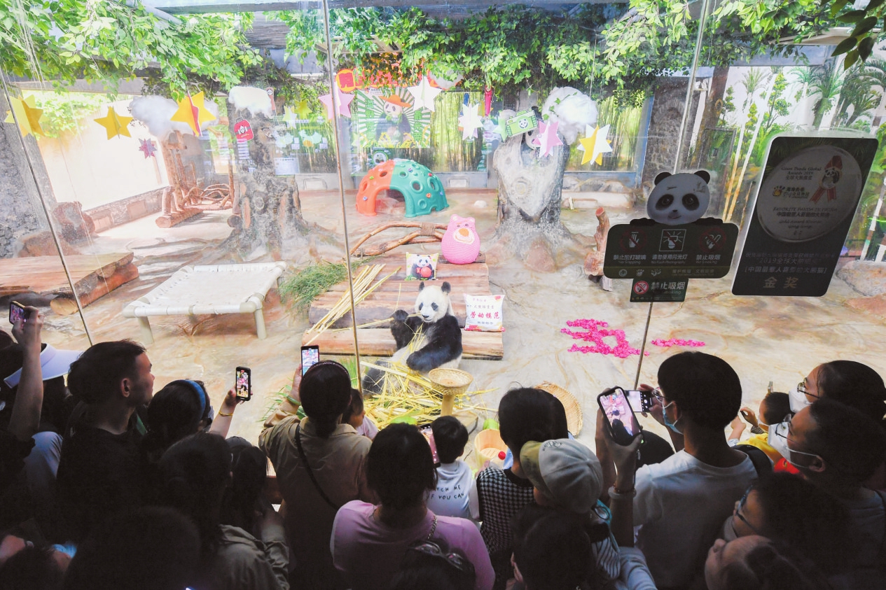 4月30日,在海南热带野生动植物园,市民游客围在网红熊猫贡贡前打卡拍照。 本报记者 孙士杰 摄