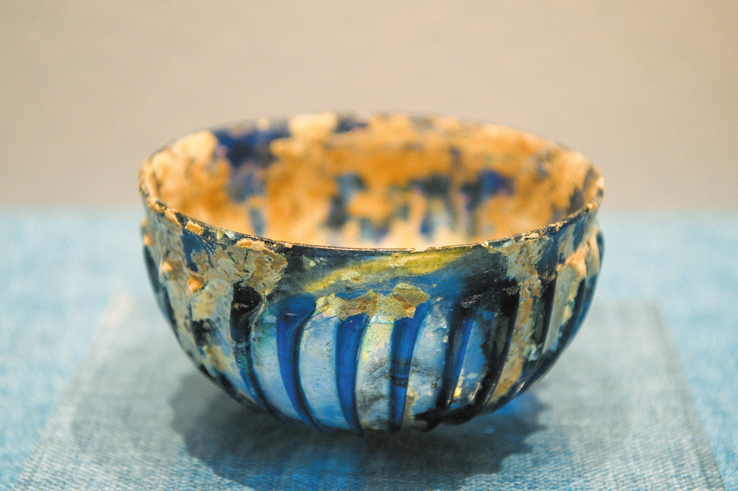 来自东地中海地区公元前1—1世纪的凸脊纹装饰碗,用蓝色透明玻璃制成的凸脊纹装饰碗,脊状纹饰高高隆起。根据热垂下法制作而成,边缘和内面被打磨光滑,受风化的银化膜呈现出彩虹的颜色。