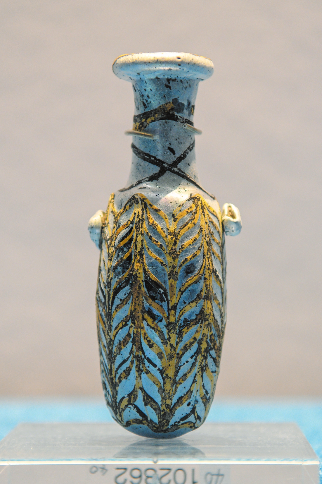 来自公元前15世纪北美索不达米亚的细首尖底瓶,以硬核成型法制成的玻璃香油瓶。在风化后呈现出浅褐色的玻璃胎体,装饰着白色和黄色的玻璃丝,趁热用细小的工具朝一个方向用力划动,便形成弯曲连缀的纹路。