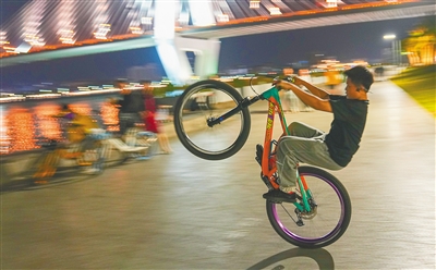 几乎每周末,14岁的初二学生舜舜都会约上三五好友,骑上各自的自行车,奔赴一个目的地。他们经常从世纪公园出发,向西骑行,一路经过万绿园、西秀海滩,抵达假日海滩。“当你和朋友骑车吹着海风追黄昏,看着城市的风景一一擦身而过,耳机里播放着喜欢的音乐,快乐就是这么简单。”舜舜说。