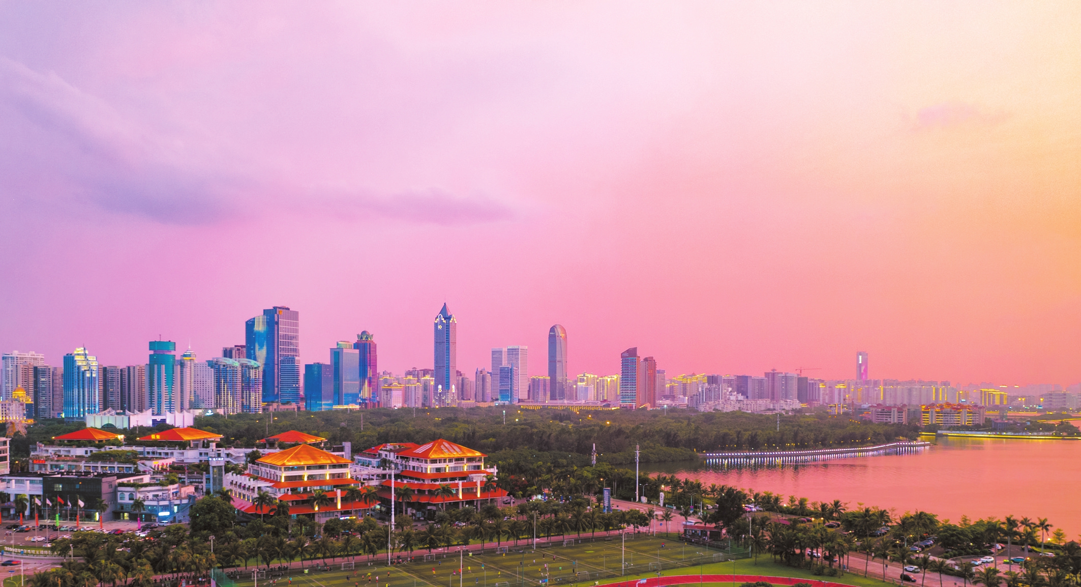 傍晚的海口世纪公园风光旖旎,灯光映在海面上,更多了几分氤氲的风情。 本报记者苏弼坤摄