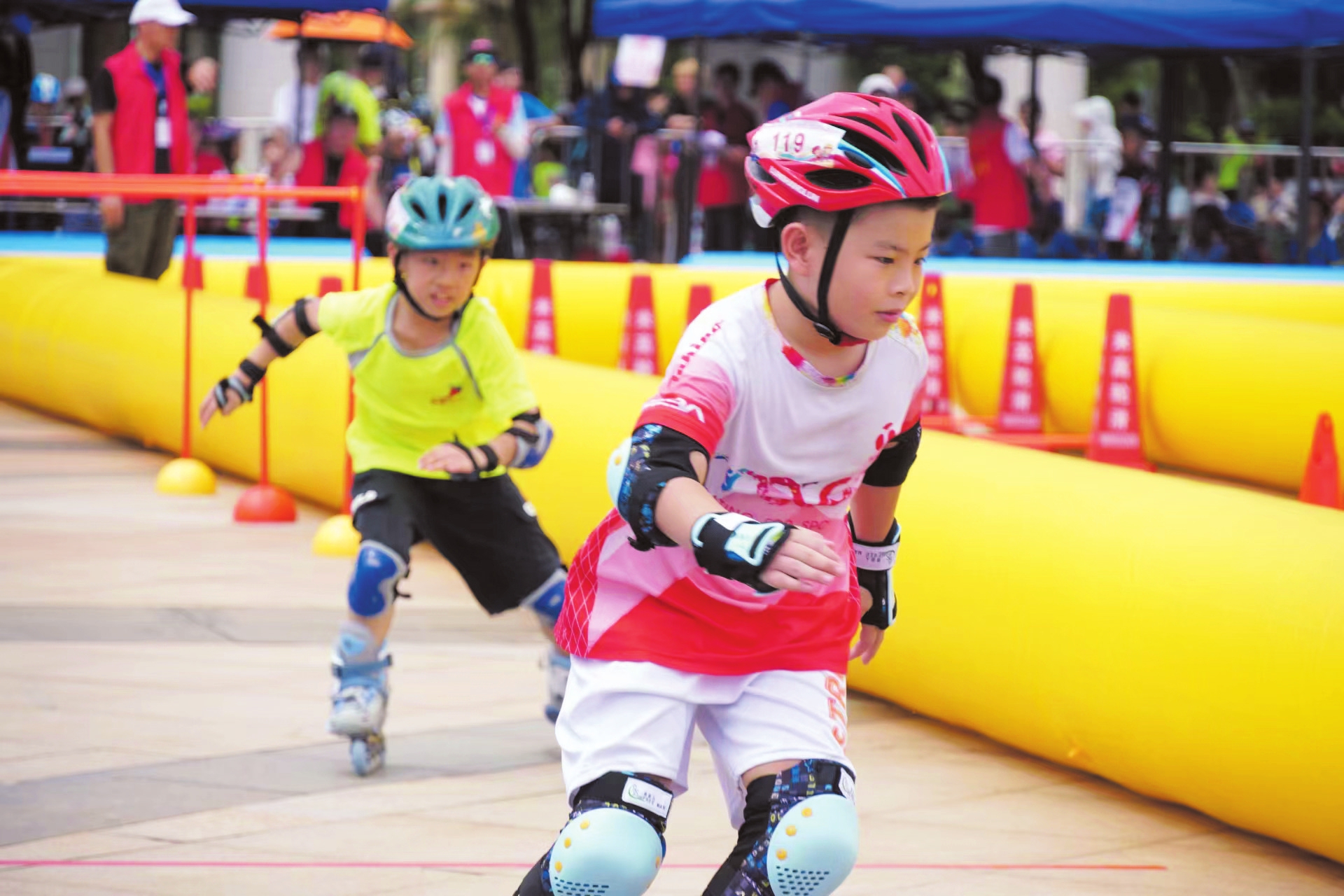 活力轮滑,驰骋少年。比赛中,轮滑少年个个全副武装,重心下移,凝视前方,随着裁判一声令下,他们如离弦之箭般奋勇向前。目视前方、弯腰屈膝、双臂摆动、双脚驰骋……只见少年们斗志昂扬、冲劲十足,动作平滑舒展,身姿矫健潇洒,脚下转动的飞轮幻化出美丽的弧线。活动最后,各项目分别决出了本组别的前三名。