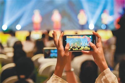 观众用手机拍摄黎族传统歌曲展示。本报记者 王程龙 摄