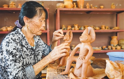 三亚天涯区黑土村的非遗传承人正在制作黎陶器皿和雕像。本报记者 武威 摄