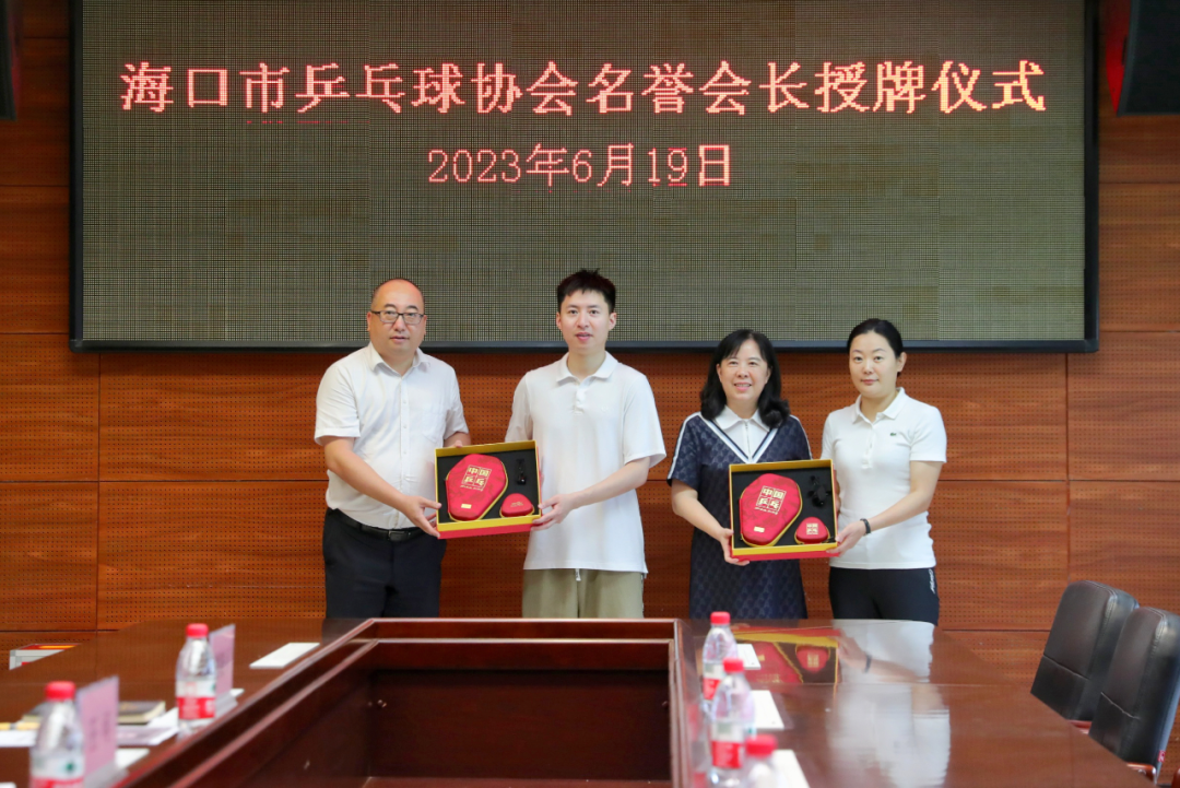 世界冠军方博给海口市旅游文体局赠送乒乓球及球拍,他表示:“我很荣幸能担任海口市乒乓球协会荣誉会长。我对海口很熟悉,之前在国家队时曾来海口集训,之后自己也来过几次。接过荣誉会长聘书,意味着肩负重任,以后我将为海口乒乓球运动发展作出更多贡献。”