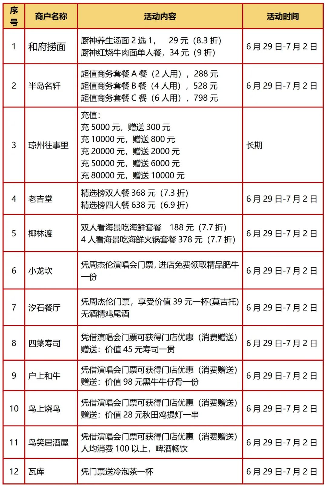 活动内容: 6月29日至7月2日,凭周杰伦海口演唱会门票到店用餐即赠60元代金券一张。(单桌消费满500元可使用一张,活动期间仅可享受一次,不与店内其他优惠同享)。