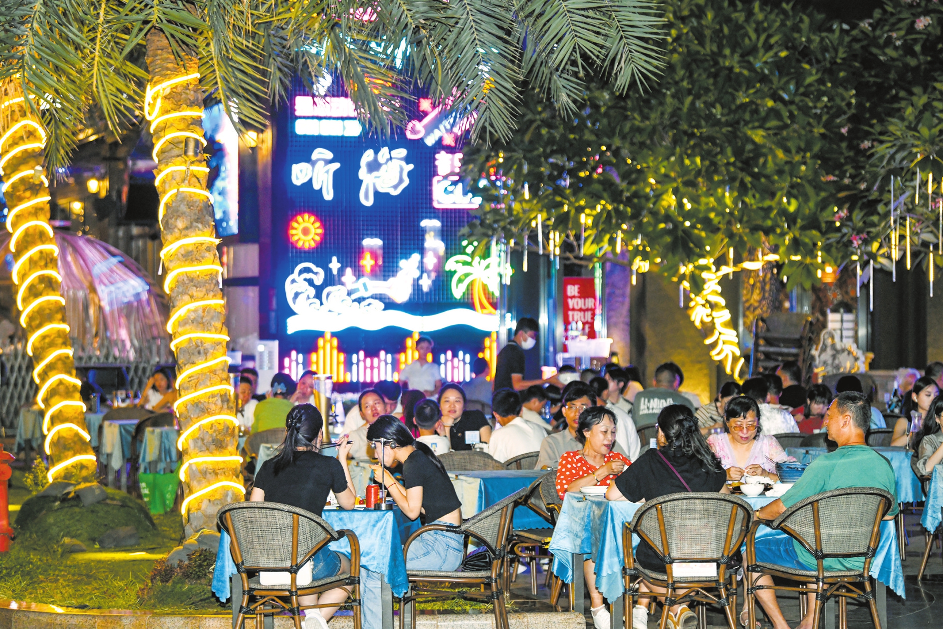 7月1日,在海口湾外滩酒吧一条街,市民游客正在休闲、用餐,享受夏日时光。本报记者 康登淋 摄