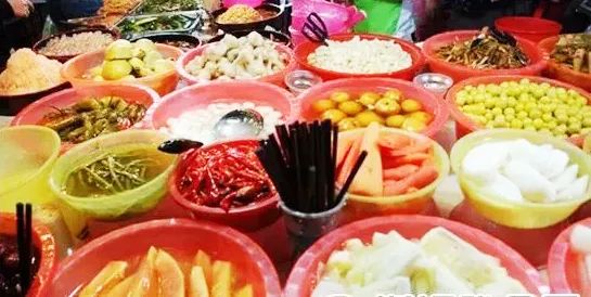 “酸甜”的汤水主要成分是醋,泡制“甜酸”的水果通常有菠萝、西瓜、木瓜、青瓜、芒果、酸菜、番石榴、西瓜皮、白萝卜丝等,几样堆起来装在一个碗里,色彩鲜艳,吃起来翠嫩爽口,水果的清甜和汤水的酸甜混合起来,让人欲罢不能。