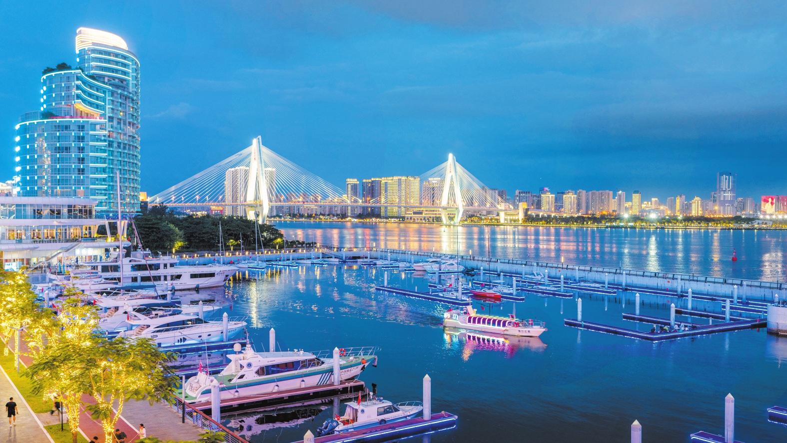 夜幕下的华彩·海口湾广场游艇码头灯火璀璨,风光旖旎。不少市民游客选择乘坐游艇,从海上一览海口湾绚丽多彩的灯光秀。本报记者 石中华 摄