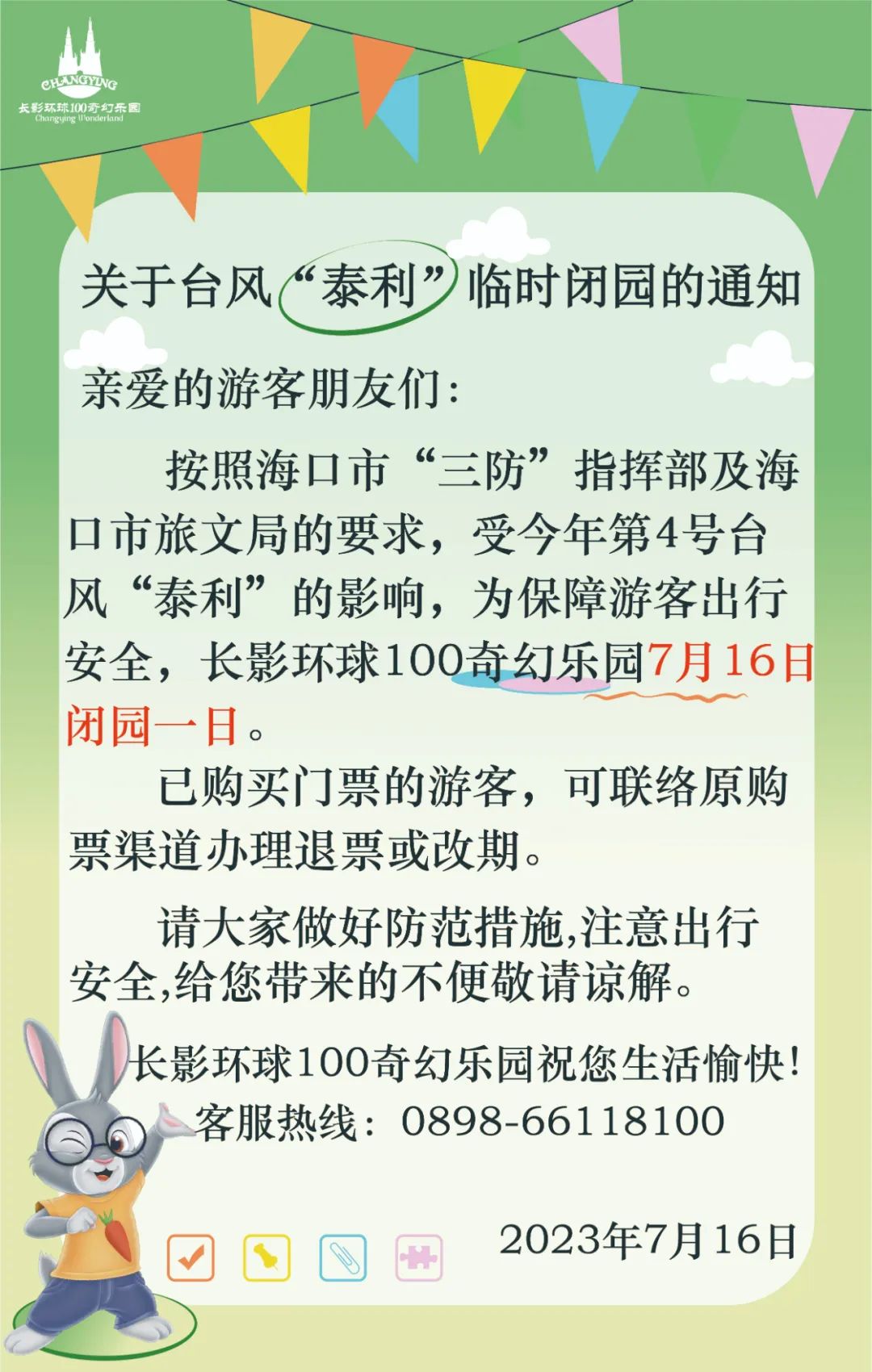 为保障市民游客人身及财产安全,海口东寨港红树林旅游区自2023年7月16日起临时闭园,景区恢复开放时间另行通知,16日已购票并未入园的游客,可由原路径申请全额退还票款。