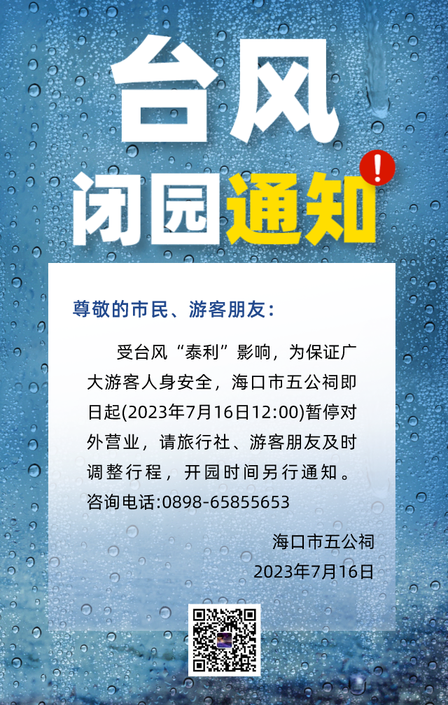 因受今年第4号台风“泰利”影响,为切实保障市民游客的安全,据防台风三级响应要求,海瑞文化公园于2023年7月16日9:30起临时关闭景区,后期将视天气情况开放。