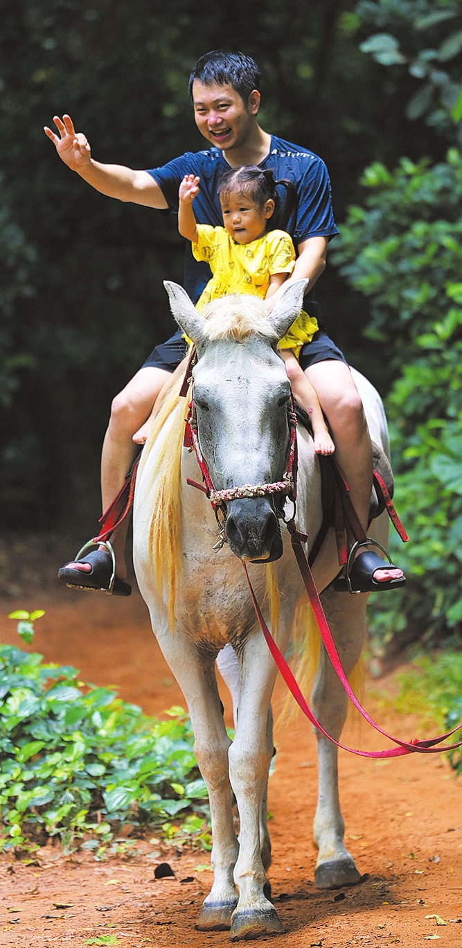 ①7月23日,在海南热带野生动植物园内,不少家长带孩子体验骑马。