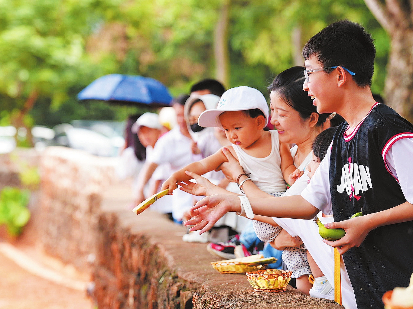 ②7月23日,在海南热带野生动植物园内,小朋友排队给大象喂食。