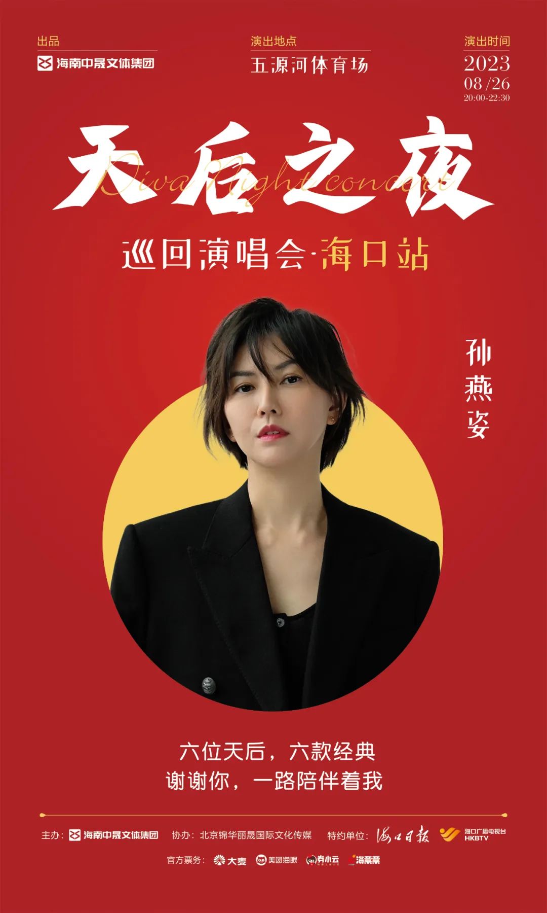 8月26日,天后之夜巡回演唱会海口站将在五源河体育场梦幻开启,孙燕姿也将在这里带你用歌声“遇见”青春。