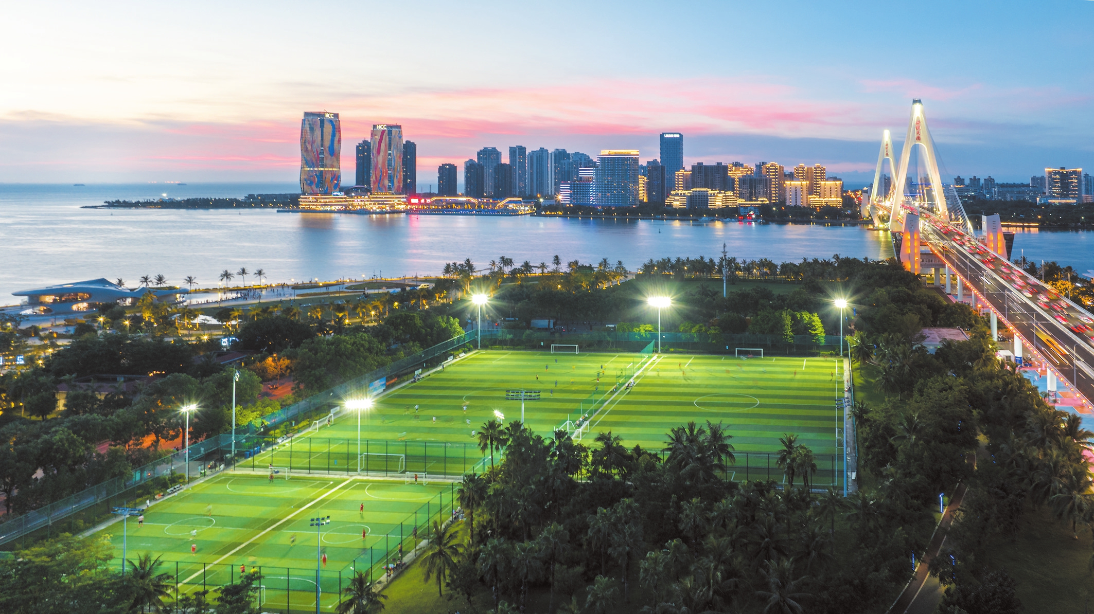 7月22日傍晚的海口湾畔,伴着柔和的晚风与绚烂的晚霞,市民群众在海口世纪公园足球场健身运动。