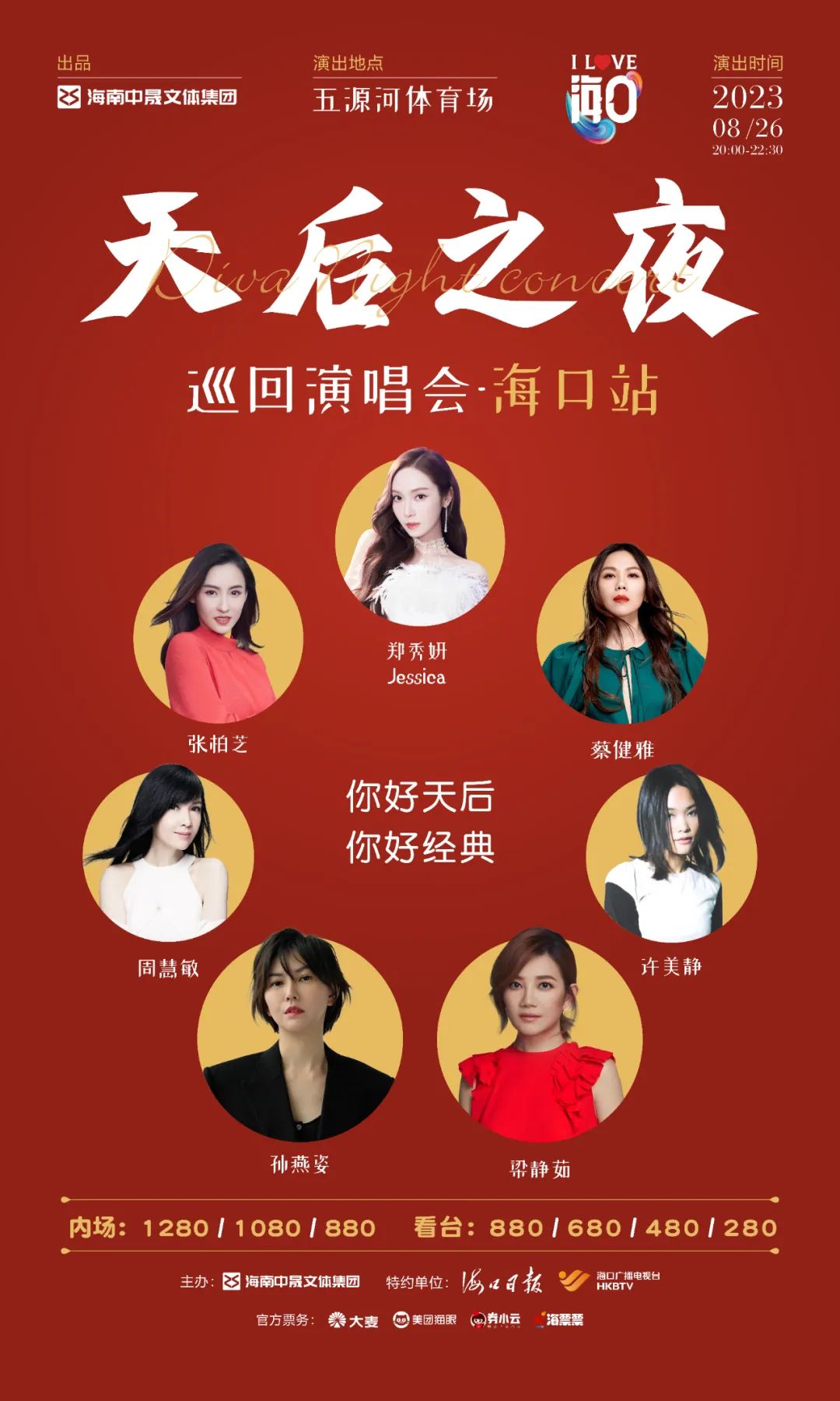 天后之夜巡回演唱会海口站强势来袭,许美静、蔡健雅、张柏芝、周慧敏、梁静茹、孙燕姿多位天后首次同台,共聚海口,上演华语乐坛巅峰之夜。