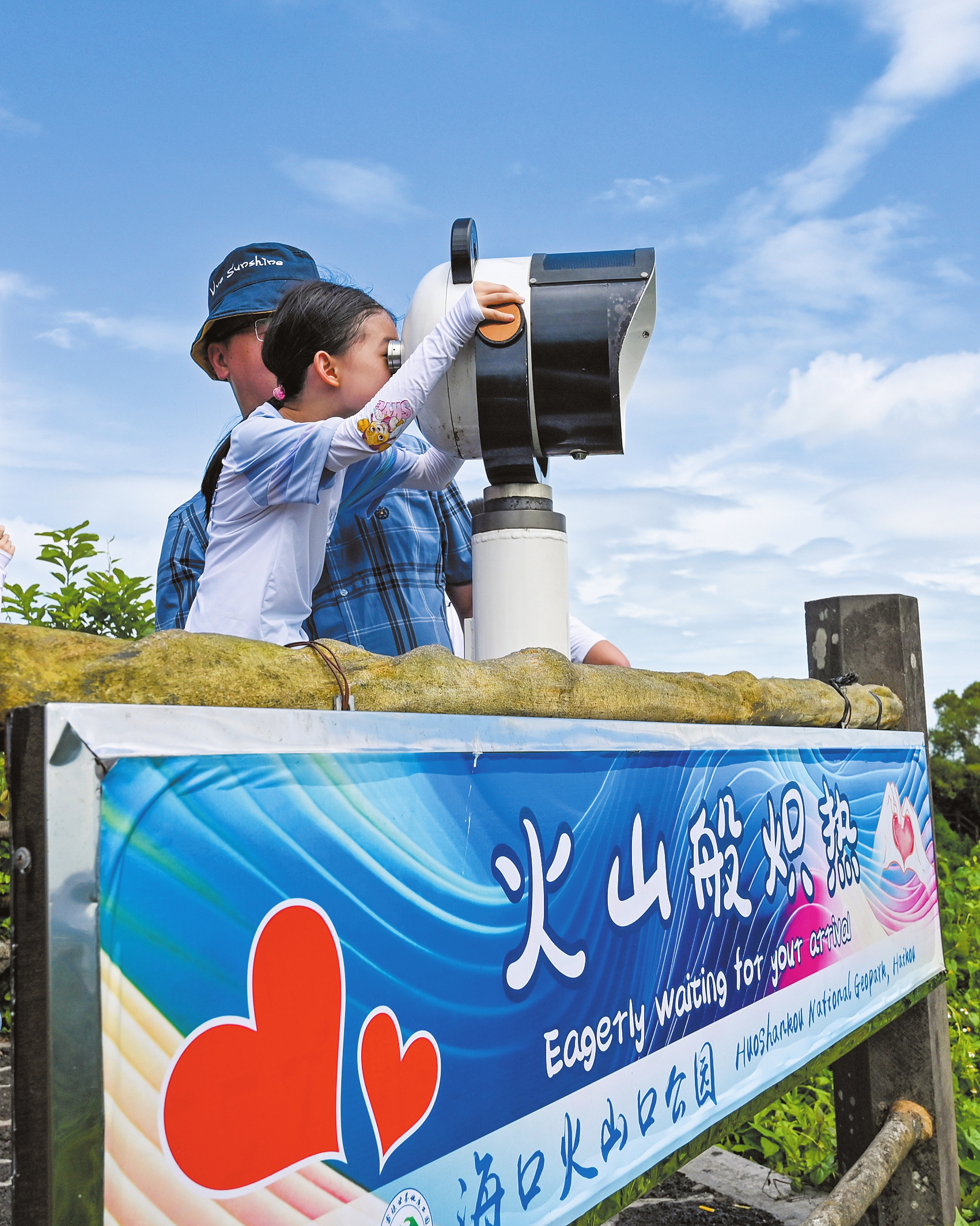 8月7日,火山口公园内,小朋友兴致勃勃地在观景台处观光望远。