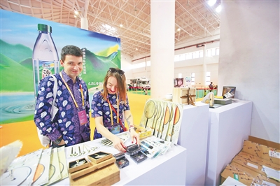 第四届海南世界休闲旅游博览会现场,外国客商参观展台。