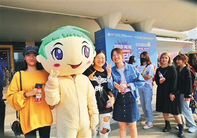 第四届海南世界休闲旅游博览会现场,观众与吉祥物合影。