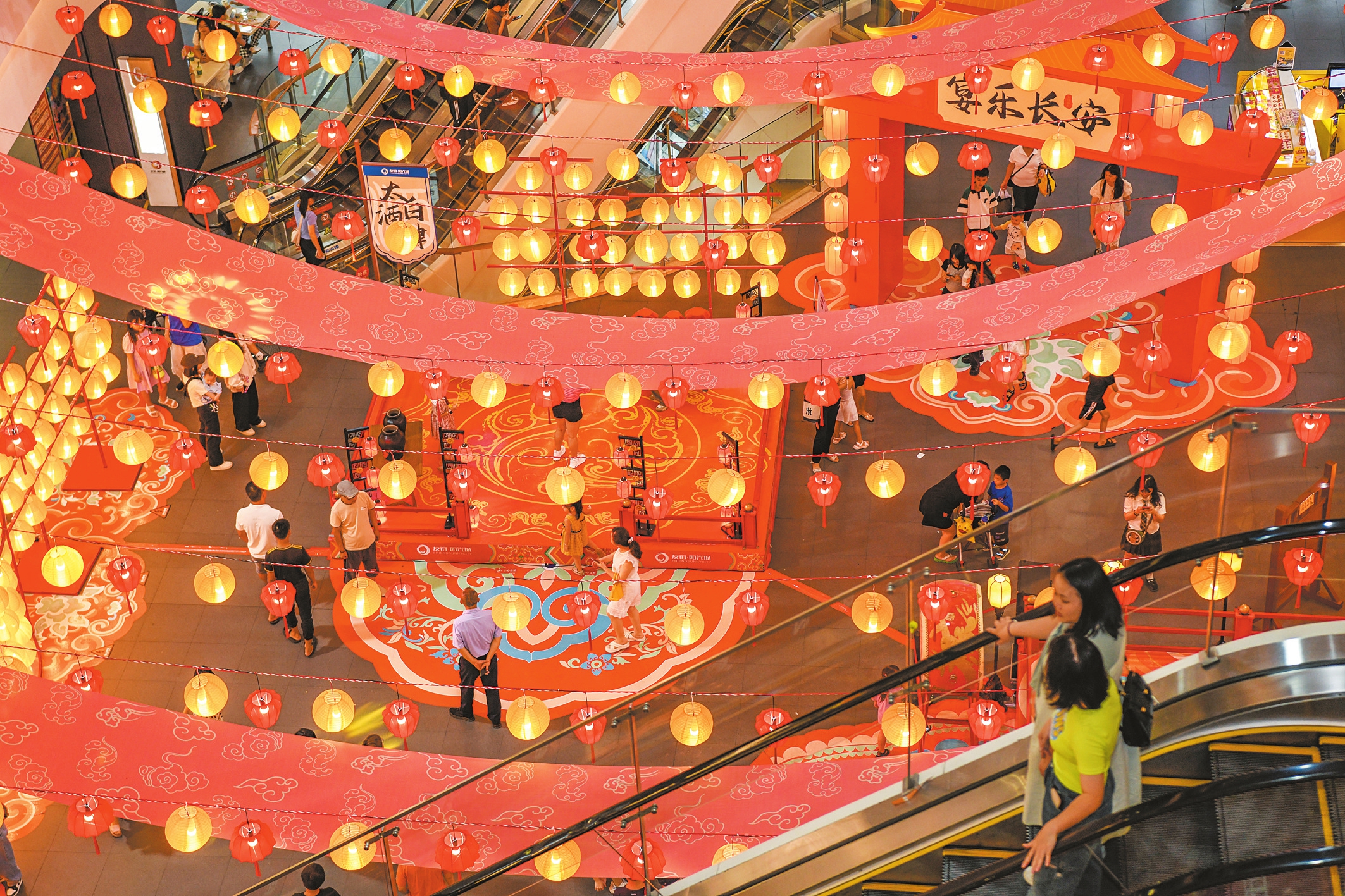 8月21日上午,位于龙华区金龙路的友谊阳光城六楼中庭,红色调的美陈,红黄相间的灯笼,团扇、油纸伞……各类元素尽显古风雅韵,弹古筝的演员仙气飘飘,余韵悠长。身着华美汉服、妆容精致的市民游客,行走在古香古色的场景中,仿佛穿越千年时光。