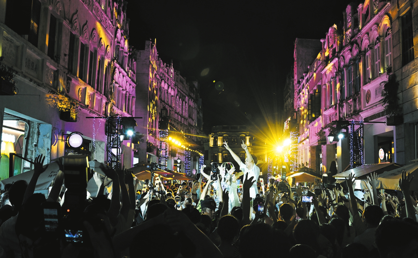 游客在海口骑楼老街观看演出(8月22日摄)。