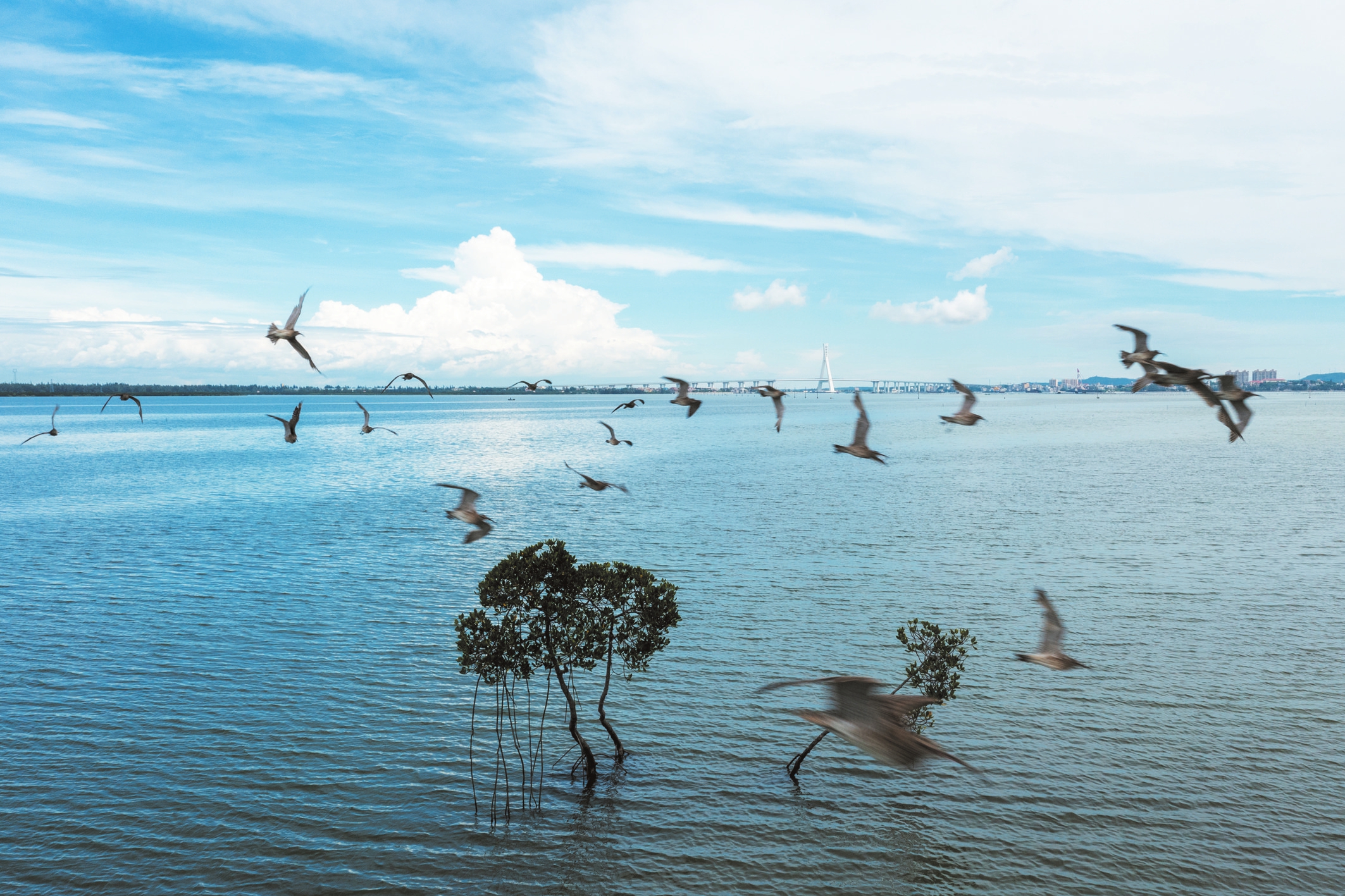 日前,在海南东寨港国家级自然保护区,一群中勺鹬展翅飞掠过红树林上空。据了解,海南东寨港国家级自然保护区位于东亚-澳大利西亚候鸟迁徙路线上,是重要的水鸟迁徙及越冬栖息地,每年8月底9月初,就会有越冬水鸟陆续飞来,在此越冬或迁飞。