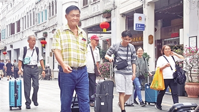 游客们在海口骑楼老街游玩。