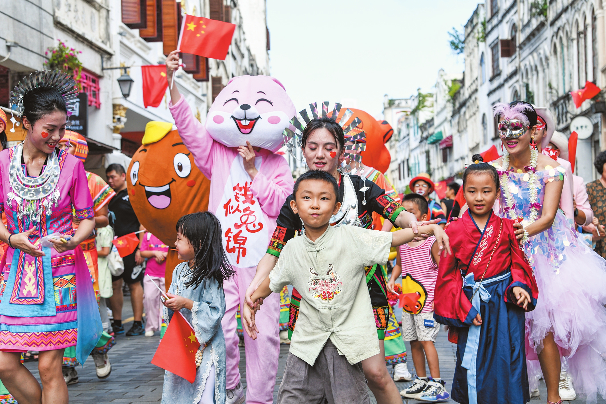 中秋国庆假期,在海口骑楼老街,别开生面的《顺“骑”自燃》街艺巡游活动吸引不少市民游客参与。 本报记者 康登淋 摄
