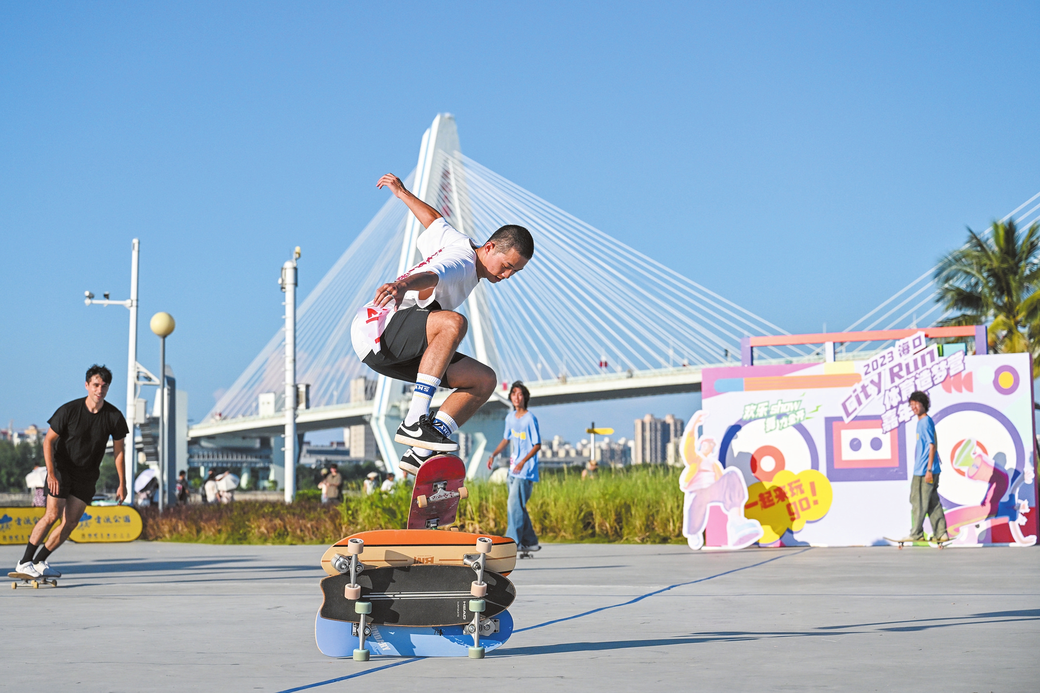 在云洞图书馆举行的2023海口City Run体育造梦营嘉年华“低空飞行邂逅落日”活动,滑手们激情表演吸引众多市民游客观看。本报记者 杨鹤 摄